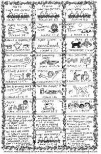 Praying in Color offers adults and children a way to mark the day-by-day journey to Christmas by daily praying & drawing with a calendar template. The author says, “When I draw, color, and doodle my own Advent calendar, I feel like I’m building something rather than tearing it apart. It is a countup to Christmas, not a countdown. At the end of the 20-some days, the finished Advent calendar is a colorful reminder of what was in my head and on my heart. It is a record of my spiritual journey through Advent.” Various calendar templates are offered, along with suggestions for ways to pray with doodling. View and download Praying in Color Advent Calendars here along with other resources they offer.