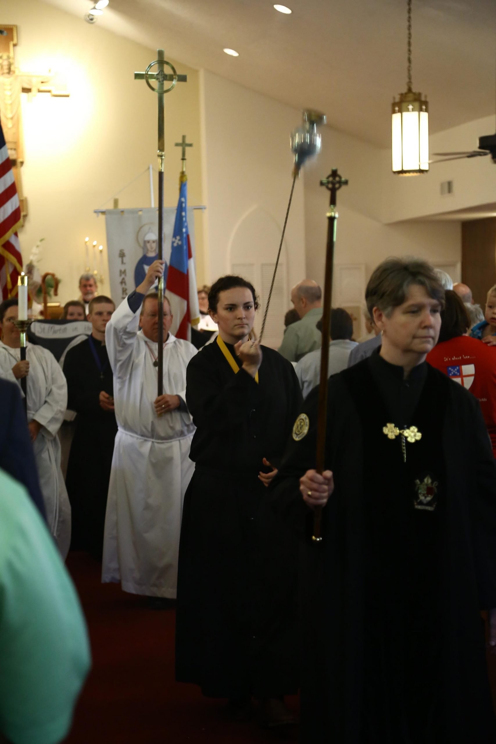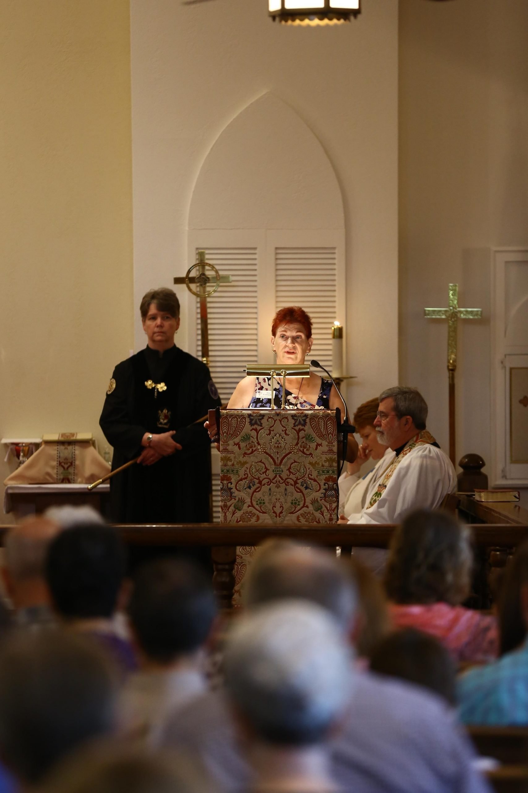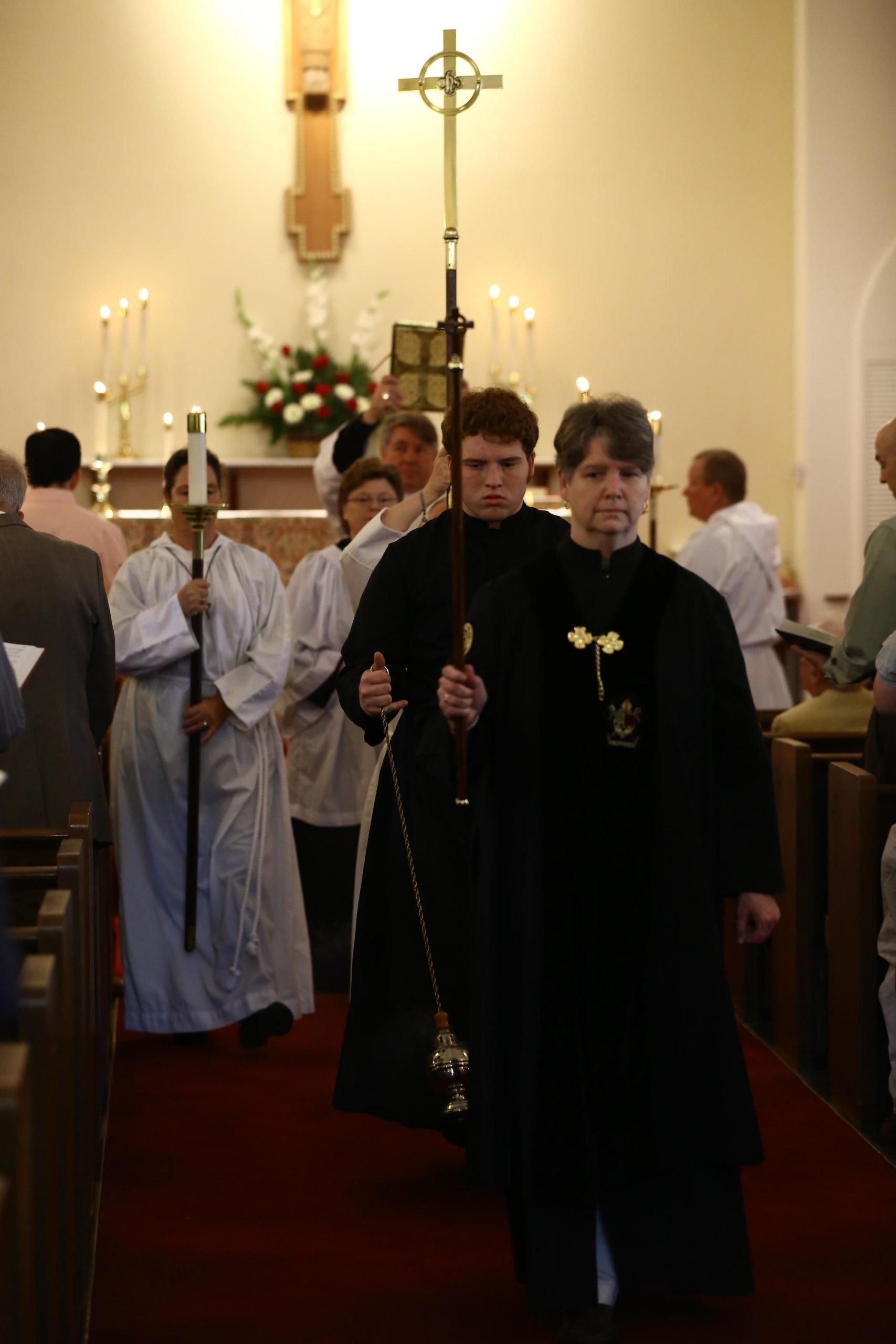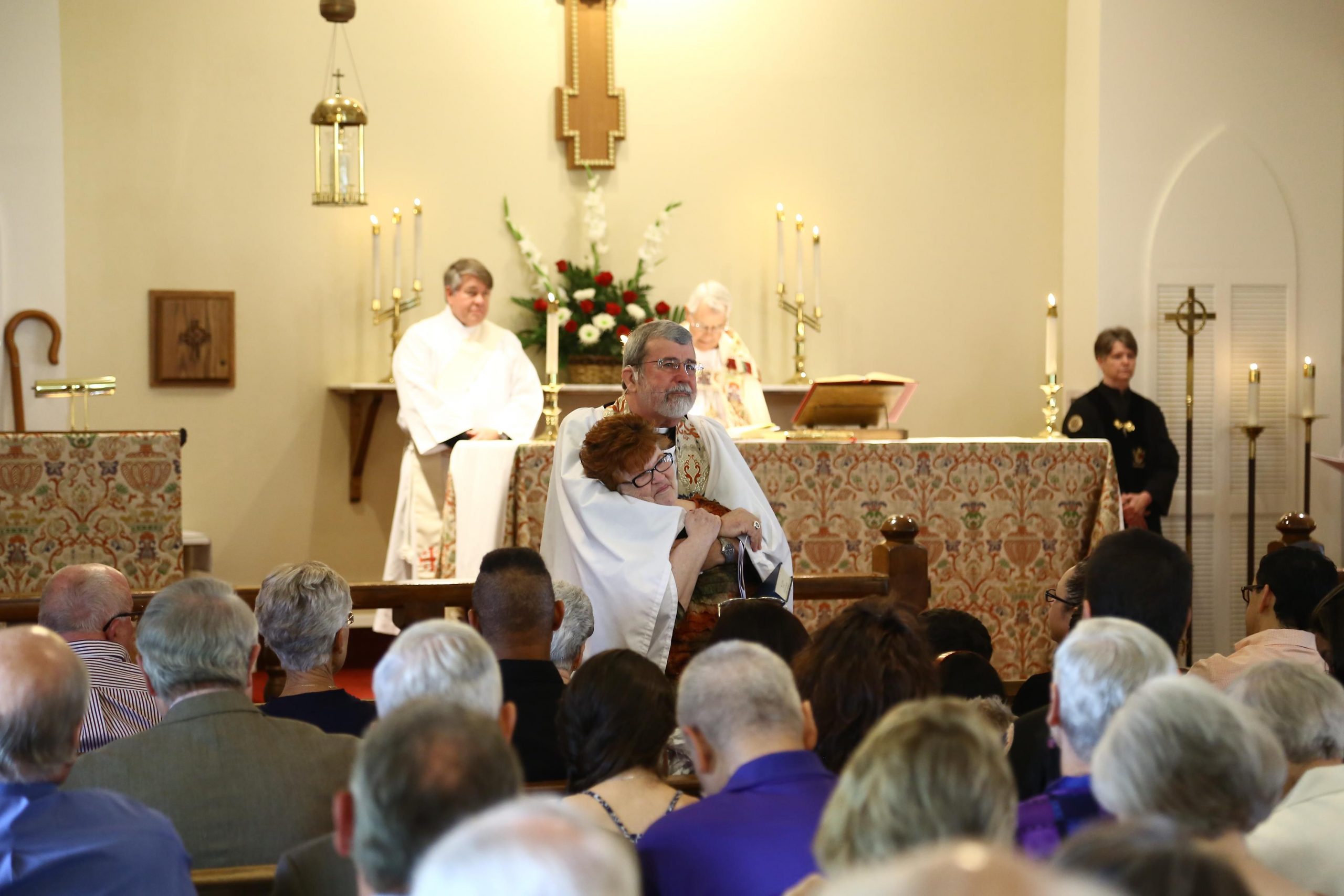 There was a procession with incense and banners and torches and crosses through the garden and into the packed church. Bishop High was present with the parish in this time of transition. In his homily, Bishop High recalled the post-communion prayer at a priest’s ordination, “We thank you for raising up among us faithful servants for the ministry of your Word and Sacraments. We pray that Jim may be to us an effective example in word and action, in love and patience, and in holiness of life.” He praised Fr. Jim for a job well done, and closed his homily with, “We celebrate the love and faithful service of Jim Reynolds at this congregation.”