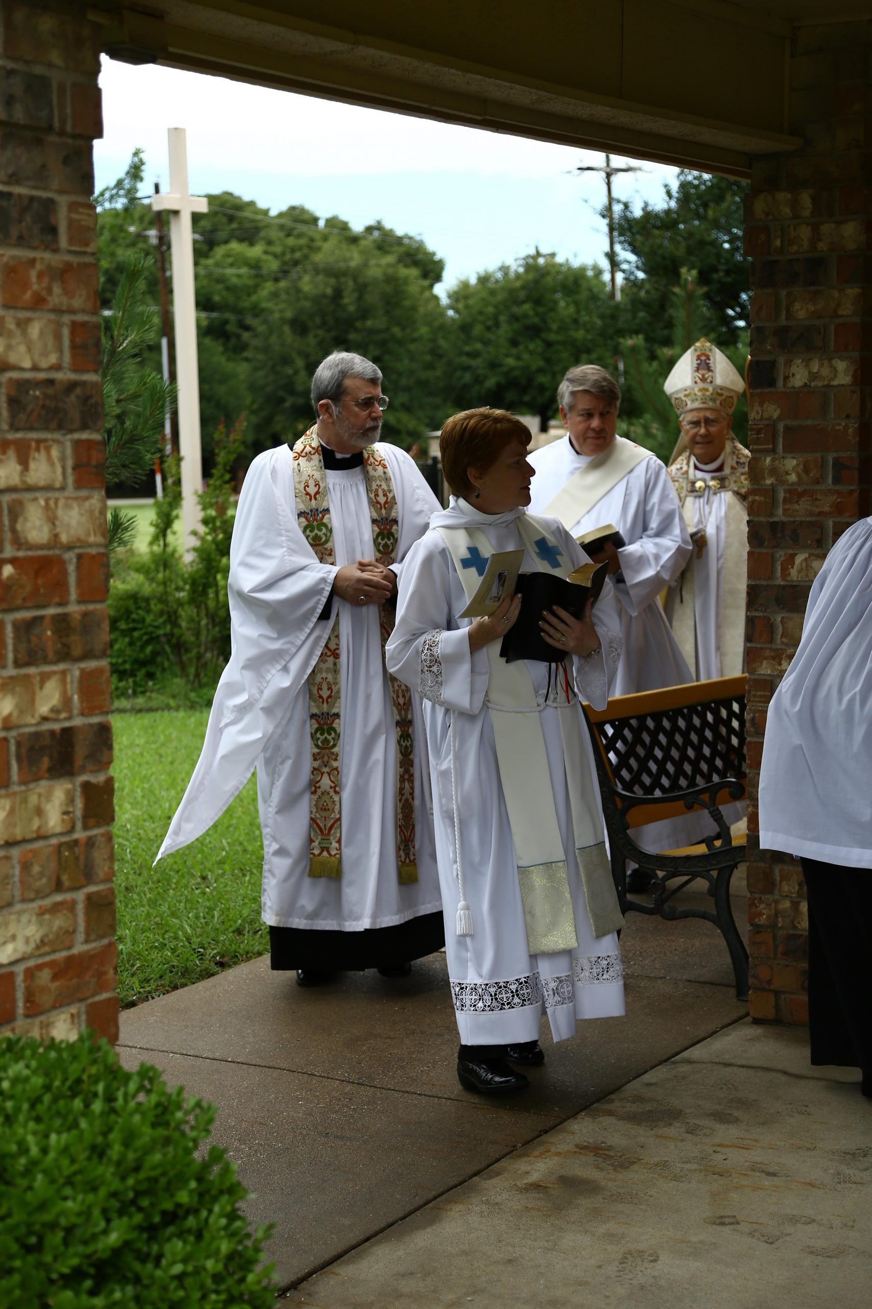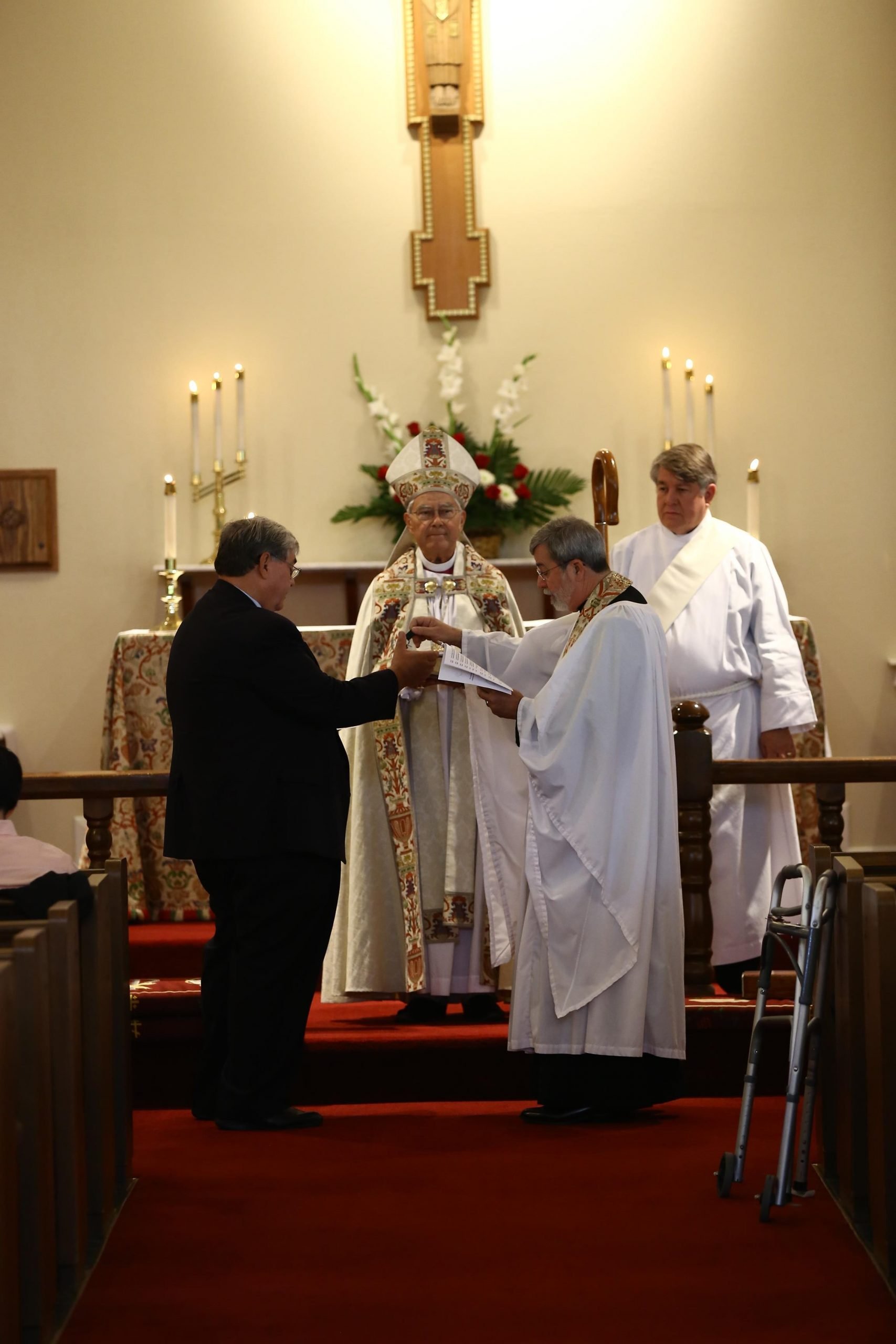 For the first time in the Episcopal Diocese of Fort Worth, there was a formal part of the service “The Ending of a Pastoral Relationship. ” Fr. Jim expressed that his tenure as rector ended. The congregation accepted the conclusion of his pastoral relationship. Fr. Jim tendered his letter of resignation, thus ending his pastoral relationship with the parish, and returned his keys to the parish buildings. The Senior Warden Bob Bess received his letter and will hold the keys in trust until a new rector begins his or her pastoral relationship with the parish. The congregation prayed together,