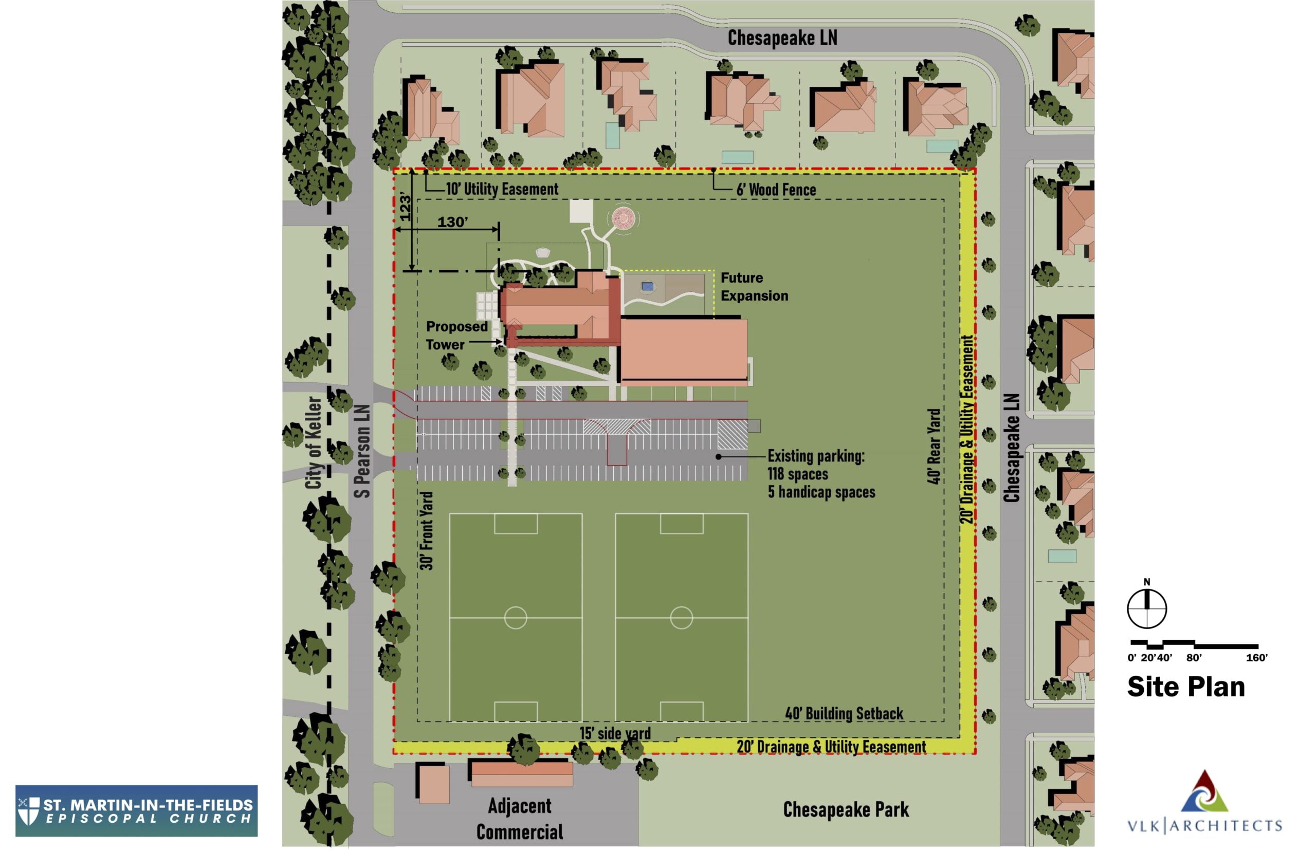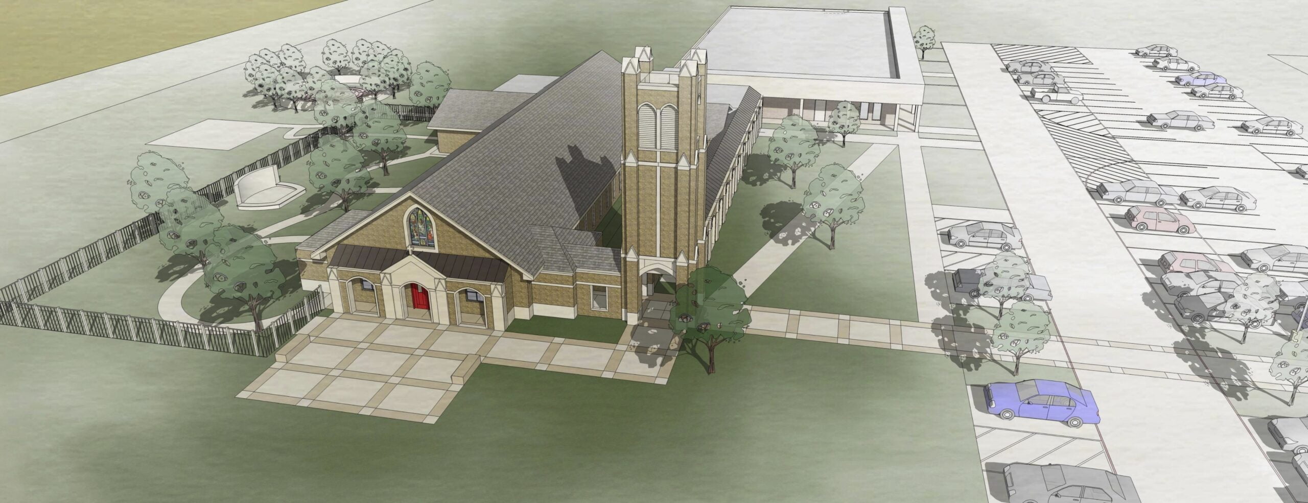 The attached information package of drawings was presented to the public and select members of the Southlake City Council on the evenings of November 8th and 9th . We are now sharing the same presentation papers with you. Note on the third page of the presentation the darker colored orange around the lighter colored orange building that is the present church building. The darker orange area represents the extent of planned exterior construction. A new church tower is proposed to be built at the west end of the current building, connected to the Parish Hall by a covered walkway. The Parish Hall itself will be connected to the current church building and its main administrative entrance will be relocated. The construction of a church tower is part of the current approved master plan. The proposed tower is consistent with those previous designs, although in a different location. The next set of drawing in our presentation package illustrate how the exterior of the building will change. The last page outlines possible interior modifications.